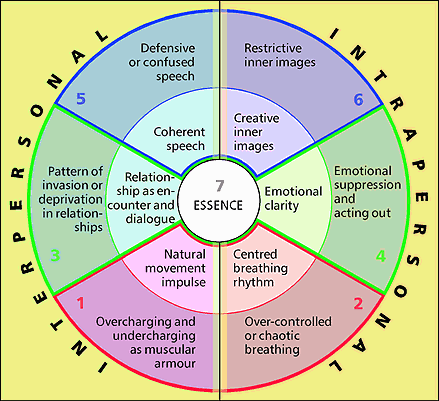 Our essence can therefore be expressed at the level of mesoderm (red) in our muscular tonus, movement and breath, at the level of endoderm (green), in our emotional experiences and relationships, and at the level of ectoderm (blue) in thinking, language and inner visions. If the environment accepts and welcomes these impulses, we can express ourselves healthily, spontaneously and freely express ourselves. If our impulses do not meet a healthy way of mirroring, but, on the contrary, refusal, restriction, humiliation or aggression, blockages appear in individual life fields as an outer circle that is further from the essence and can become the foundation of our false self, our mask. The goal of therapy is to move from the mask to the core, to the essence. The process of therapy in Biosynthesis interconnects individual areas of life fields and includes: